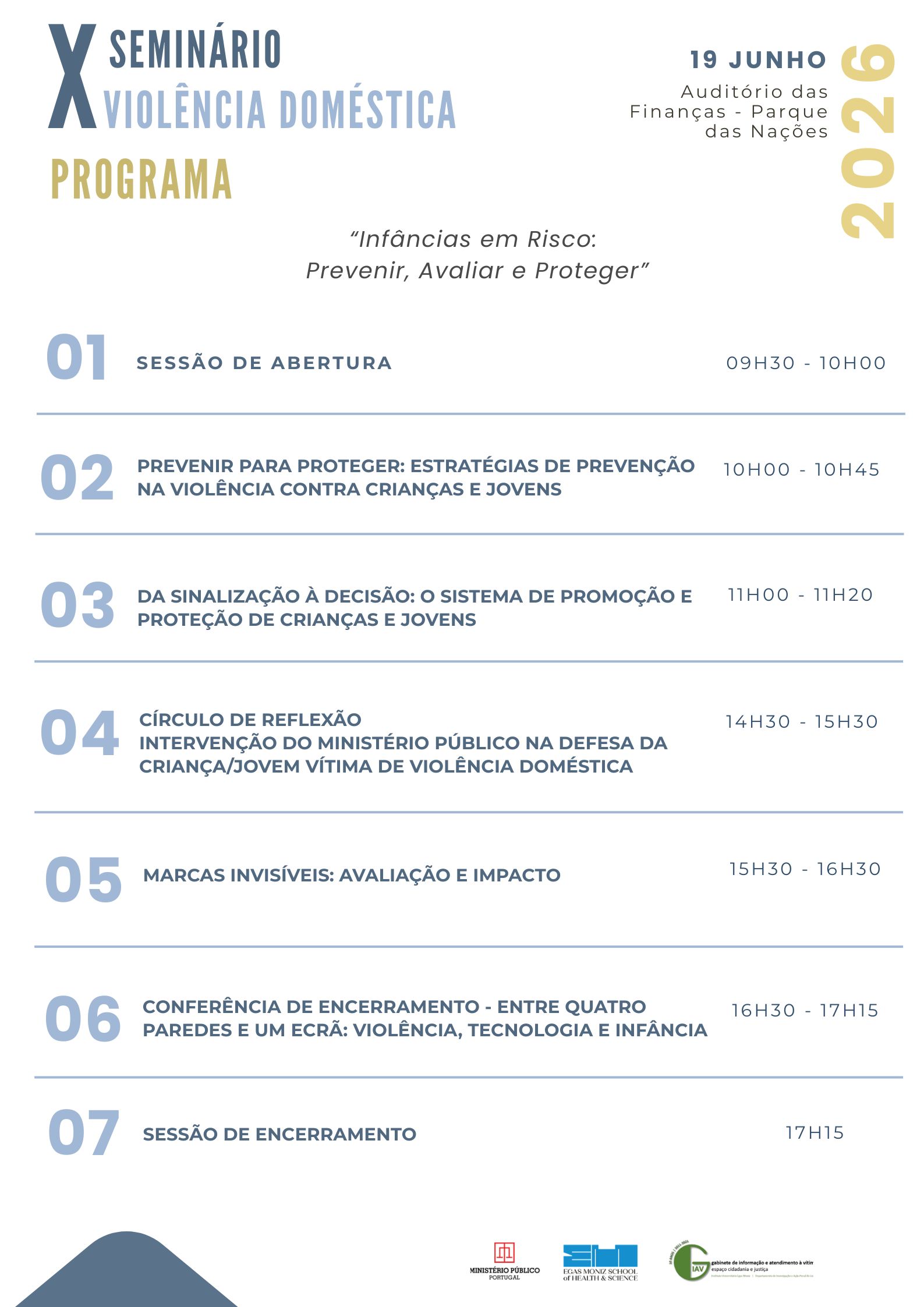 O Gabinete de Informação e Atendimento à Vítima: Espaço Cidadania e Justiça [resultante do Protocolo entre o DIAP Regional de Lisboa e a Egas Moniz School of Health & Science] e a Secção Especializada Integrada de Violência Doméstica do DIAP Regional de Lisboa (SEIVD), organizam o X Seminário sobre Violência Doméstica - Infâncias em Risco: Prevenir, Avaliar e Proteger, que se realizará no dia 19 de junho de 2026, pelas 09h30, no Auditório da Autoridade Tributária e Aduaneira, no Parque das Nações.